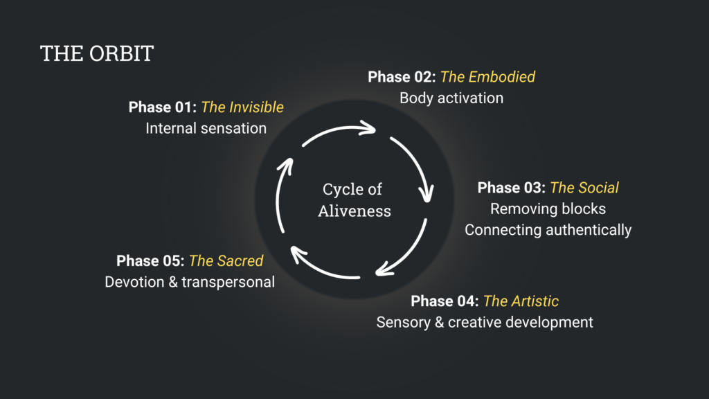 Our in-person training is designed to guide you through the Cycle of Aliveness — a journey that expands your capacity to experience the full range of being human.